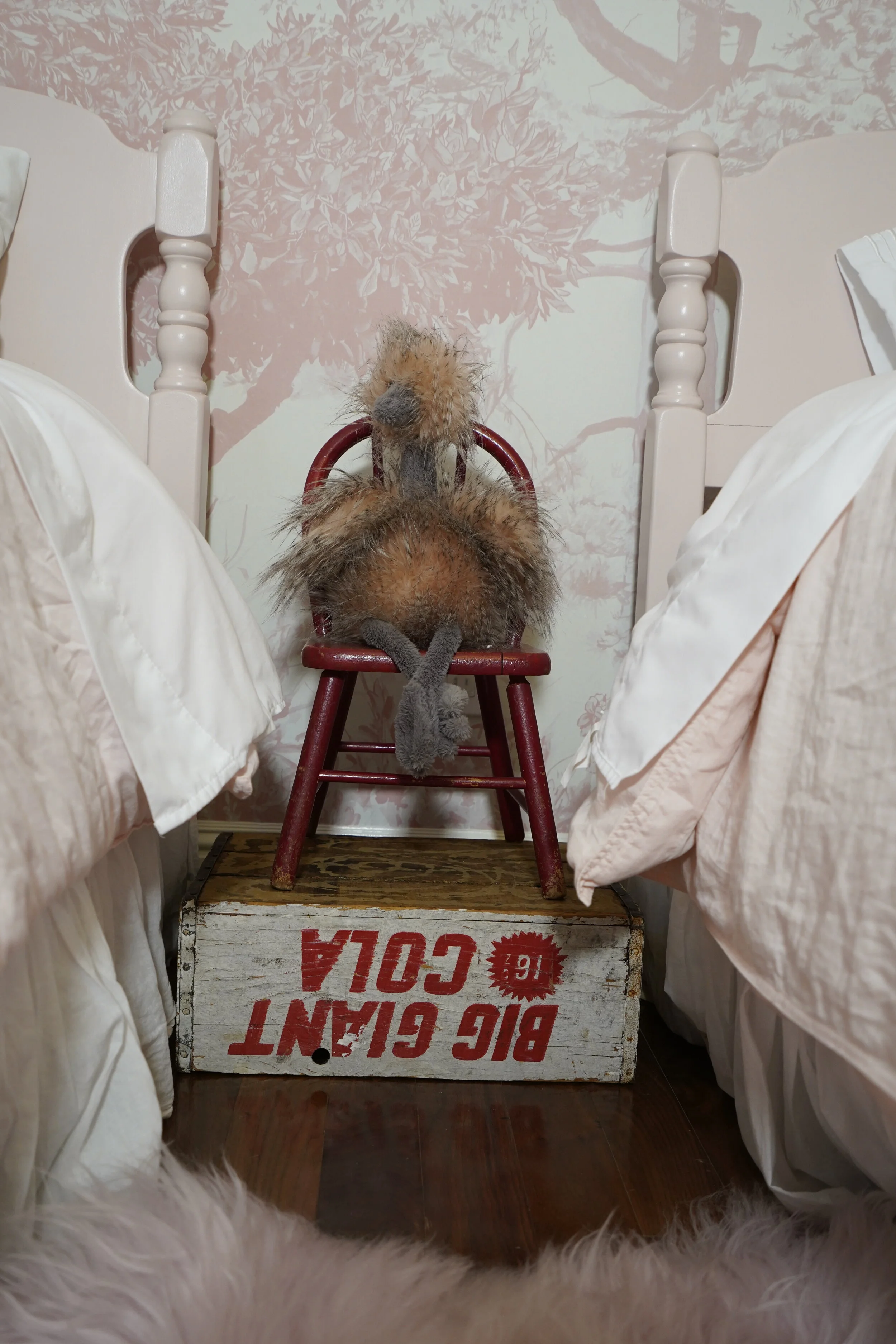 The fun thing about designing a child’s room is that you can be playful with what you bring in. A pink fur rug; an old cola crate; antique child’s chair and this great feathery ostrich create interest and whimsy in the room… replacing expensive, generic side tables.